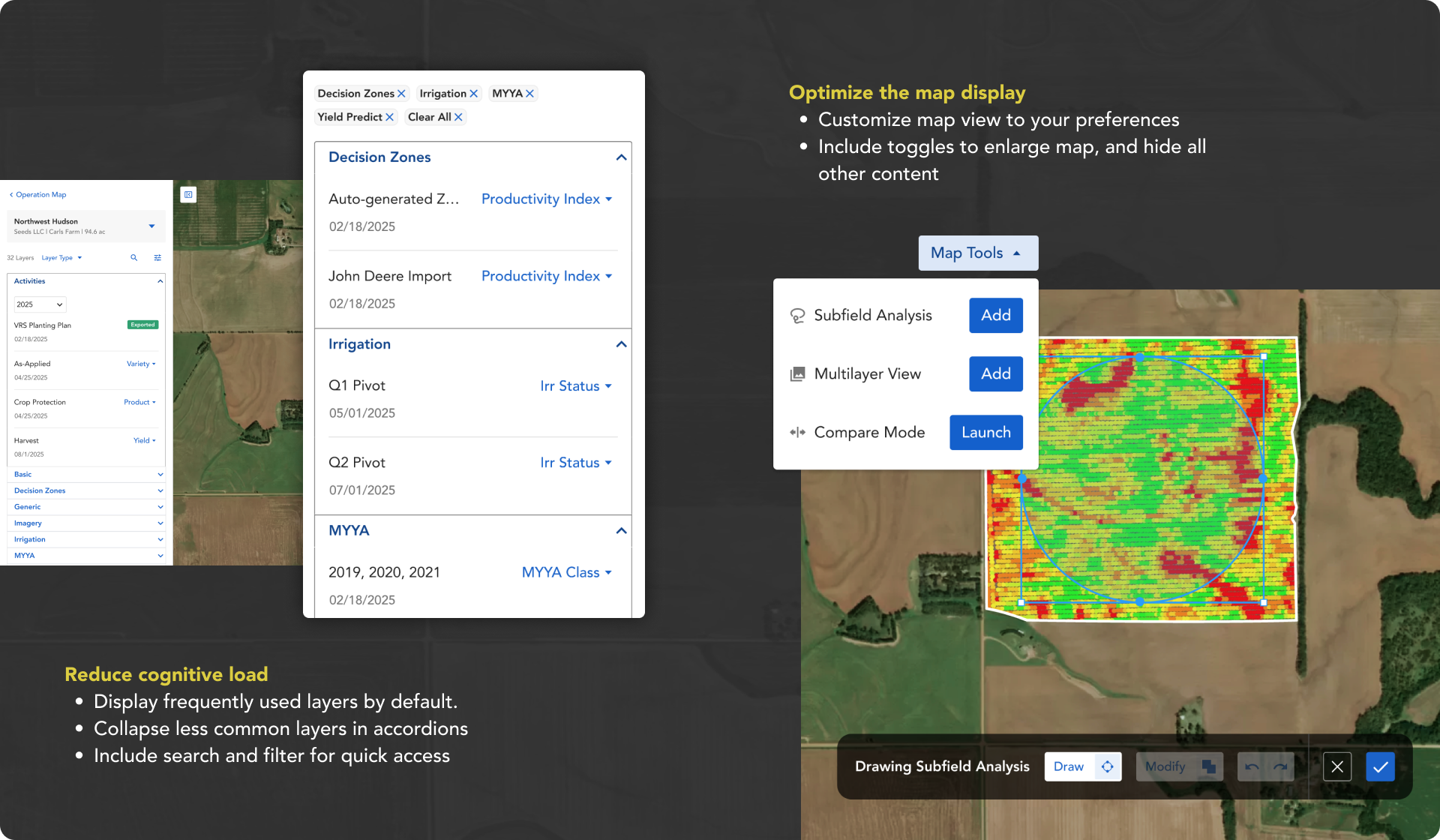 Discovery: A heuristic evaluation of the existing map was done to uncover existing flaws in the design that could be improved before additional enhancements were made. SME’s from Corteva and Seed Reps were consulted to understand the use cases behind the features we had been asked to integrate from Pioneer Field 360. And feedback from the beta release of Map Layers was collected to help refine the design.